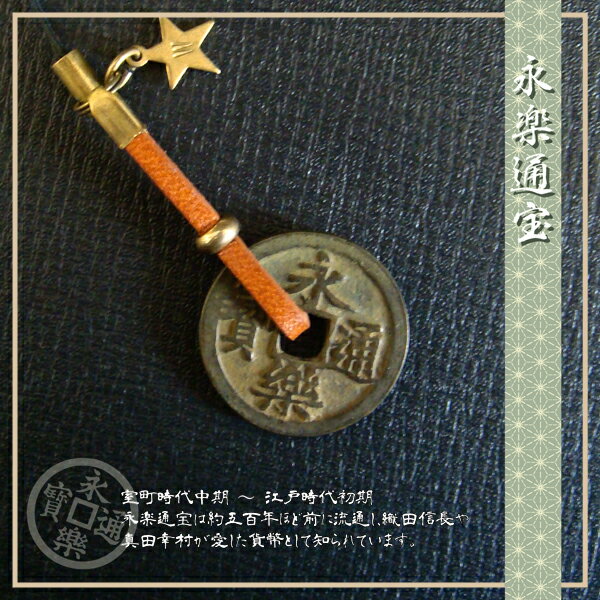 ■無料刻印■付属の星のチャームにご希望のアルファベットを無料で刻印!【永楽通宝ストラップ】戦国武将・織田信長、真田幸村が愛した、室町時代がら江戸時代に流通した約500年前の永楽通宝と本革を使用したLA 価格: 1,780円 レビュー評価:0.0 レビュー数:0 商品説明織田信長、豊臣秀吉、徳川家康に始まる多くの戦国武将が群雄割拠した激動の時代に共に生きた貨幣、永楽通宝。中でも織田信長や真田幸村は永楽通寳を家紋や旗印として使用するほど重宝したことで有名です。付属のスターチャームにご希望のアルファベットを無料で刻印してお届けしますので、還暦祝い、ギフトやプレゼントにもパーソナルユースで大変おススメなストラップになっています!■永楽通宝は室町時代中期から安土桃山時代、江戸時代初期にかけて東日本を中心に広く流通した約500年前のお金で、永楽銭と呼ばれていました。素材永樂通寳:約25mm 約3.5グラム全長サイズ:約10cm(ストラップ部分/本皮・真鍮製)無料 Supported by 楽天ウェブサービス |